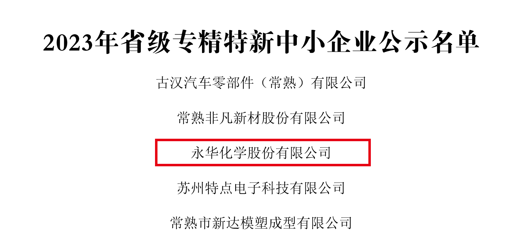 近日,江蘇省工業(yè)和信息化廳公布了《關(guān)于江蘇省2023年專精特新中小企業(yè)和2020年度專精特新企業(yè)復(fù)核通過企業(yè)名單的公示》。經(jīng)專家評審及各項(xiàng)綜合評定,永華化學(xué)股份有限公司獲評“江蘇省專精特新中小企業(yè)”。