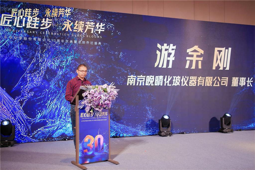 國(guó)藥集團(tuán)化學(xué)試劑有限公司總經(jīng)理潘波先生、南京晚晴化玻儀器有限公司董事長(zhǎng)游余剛先生、深圳市化試科技有限公司總經(jīng)理彭日先生作為合作伙伴代表先后上臺(tái)講話,分享與永華化學(xué)的合作故事,送上真摯祝福。