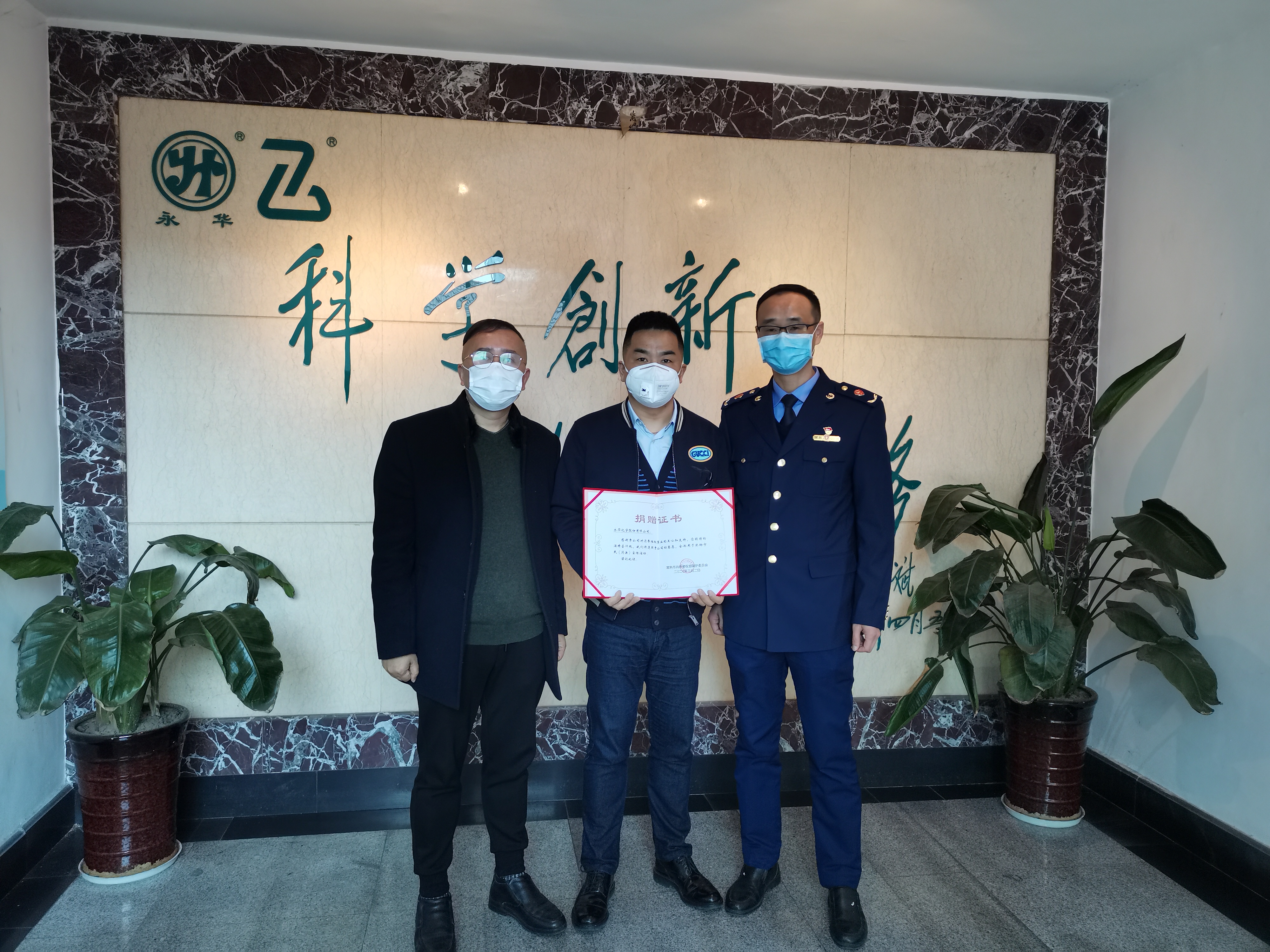 3月4日,支塘鎮(zhèn)市場監(jiān)管分局局長顧建剛,常熟市消費(fèi)者權(quán)益保護(hù)委員會秘書長曹偉為我公司頒發(fā)捐贈證書,與公司總經(jīng)理顧學(xué)峰合影留念。