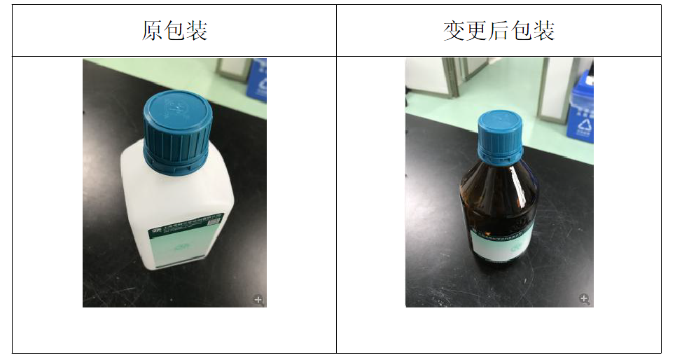 98%甲酸原為500mL 塑料瓶包裝含透氣蓋,由于甲酸能緩慢透過氣孔逸出導致包裝箱、報告單腐蝕,影響產(chǎn)品外觀,經(jīng)綜合考慮,變更為500mL 棕色玻璃瓶包裝(含內(nèi)塞)。