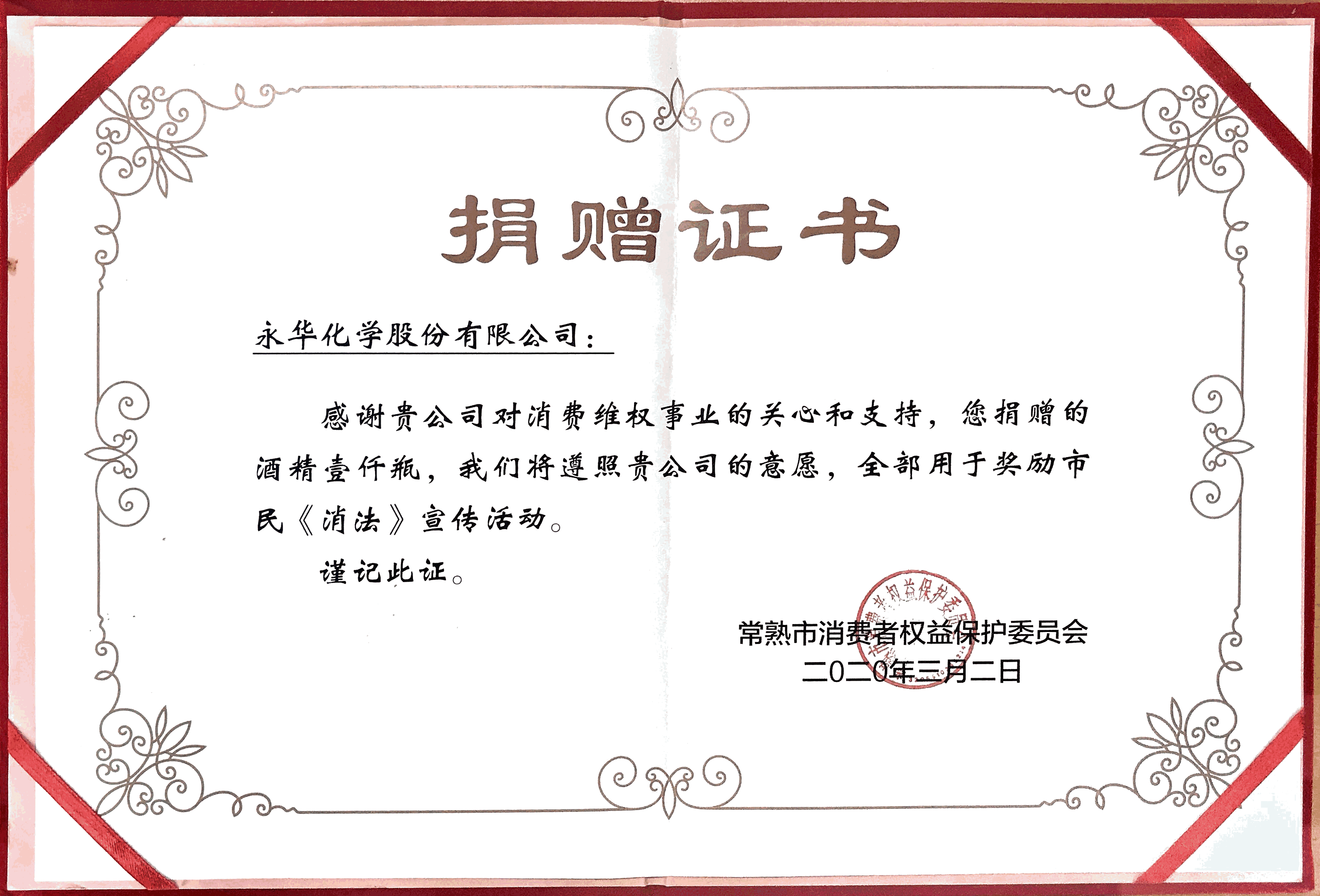 新冠肺炎疫情發(fā)生以來,疫情防控工作牽動著每個(gè)人的心。永華一直高度關(guān)注疫情發(fā)展,在按照規(guī)定認(rèn)真做好公司疫情防控和生產(chǎn)經(jīng)營部署的同時(shí),積極踐行社會責(zé)任。我公司向消費(fèi)者權(quán)益保護(hù)委員會捐贈了一千瓶酒精,用于獎勵(lì)市民《消法》宣傳活動。